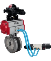 Кран шаровой DN.ru BV3232P-FP-Fb-ISO-H Ду80 Ру16, полнопроходной межфланцевый, нержавеющая сталь SS316, уплотнение - PTFE, с пневмоприводом PA-SA-130 с возвратными пружинами, с пневмораспределителем 4V320-08 220В, с БКВ APL-210N
