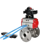 Кран шаровой DN.ru BV3232P(3pc)-FP-F-ISO-H Ду80 Ру25, трехсоставной полнопроходной фланцевый, нержавеющая сталь SS316, уплотнение - PTFE, с пневмоприводом PA-SA-140 с возвратными пружинами, с пневмораспределителем 4V320-10 220В, с БКВ APL-210N Самара