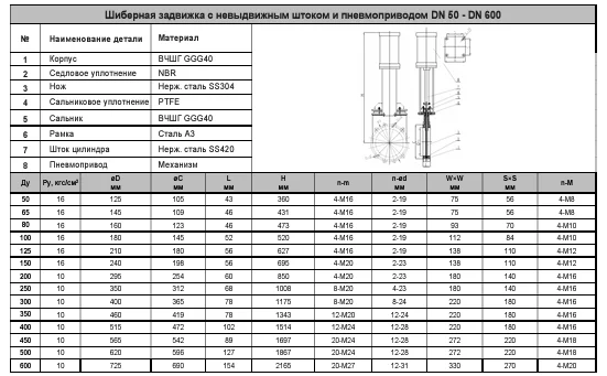 Данная задвижка укомплектована пневмоприводом. Пневмопривод является поршневым двустороннего действия. При подаче сжатого воздуха в одну из полостей цилиндра и соединения другой полости с атмосферой, поршень вместе со штоком перемещается, создавая толкающее (на закрытие) или тянущее (на открытие) усилие.
