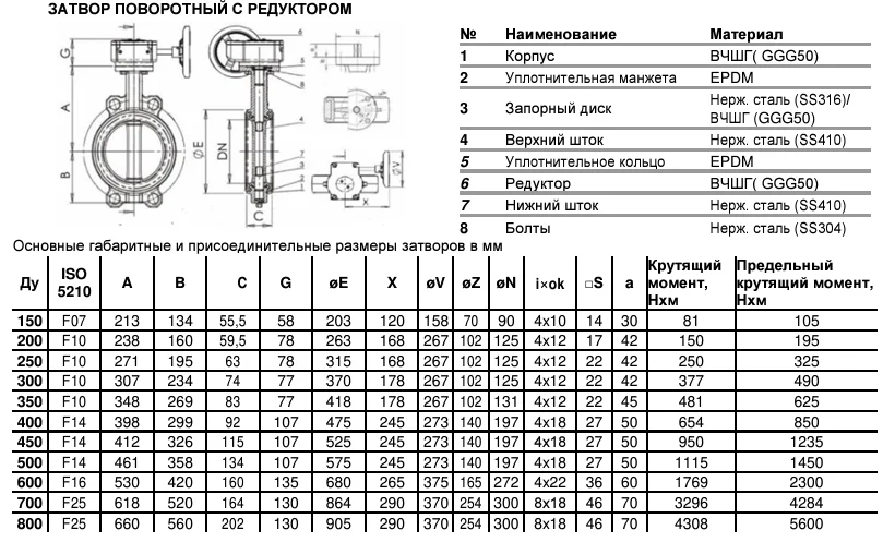 Затвор дисковый поворотный межфланцевый чугунный с нержавеющим диском манжета NBR с редуктором Benarmo Ду150-400 Ру16
